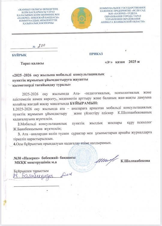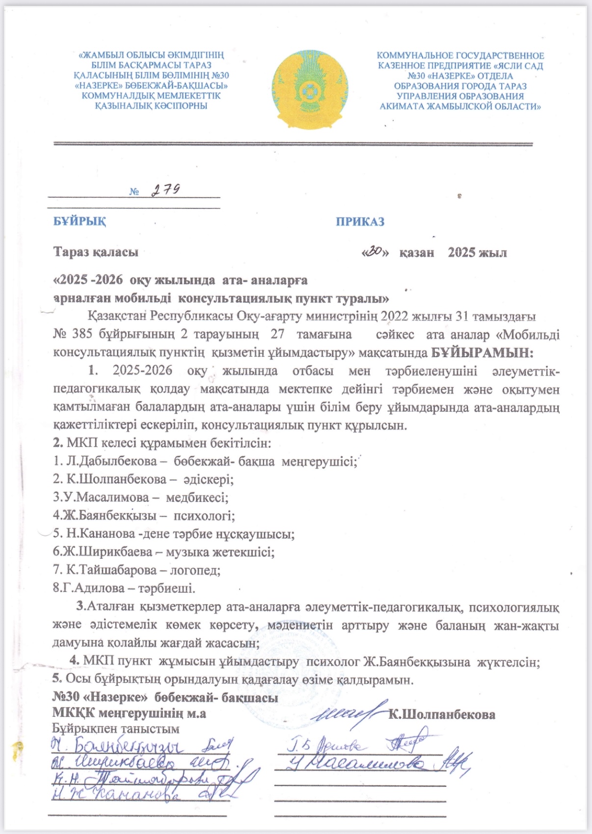 Консультациялық пункт бұйрық » №30 «Назерке» бөбекжай бақшасы